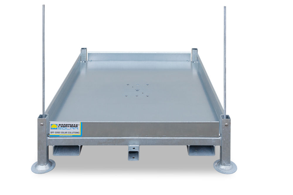 Dit zware gegalvaniseerde mobiele onderstel met dikke lepelkokers maakt het zeer eenvoudig de Poortman Solar plas-draspompen met fronthef of verreiker te plaatsen of te verplaatsen.