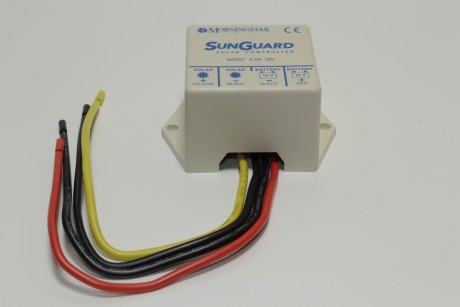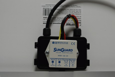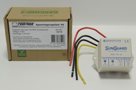 12Volt 4amp maximaal 50W maximaal Geel= + zonnepaneel, Rood= + accu, 2x Zwart= universele - aansluitingen Kunststof behuizing, giethars, vertinde koperdraden met PVC ommanteling 1 jaar
